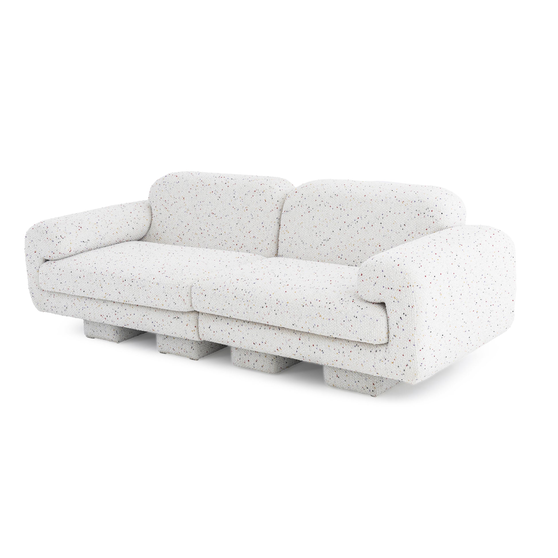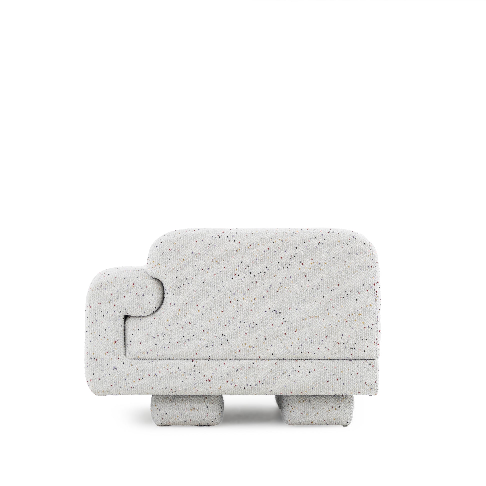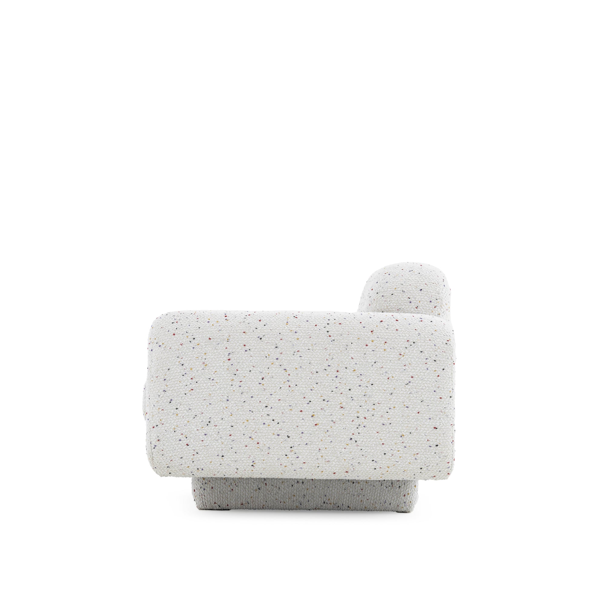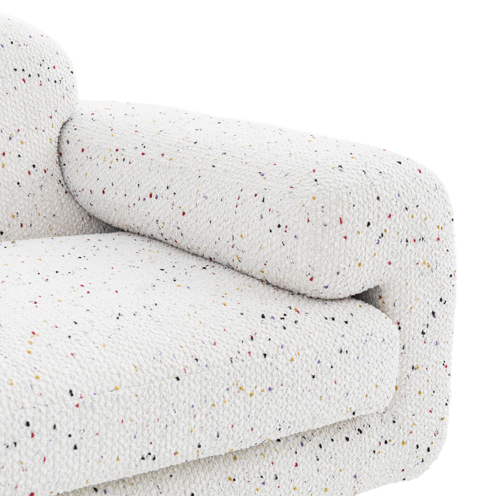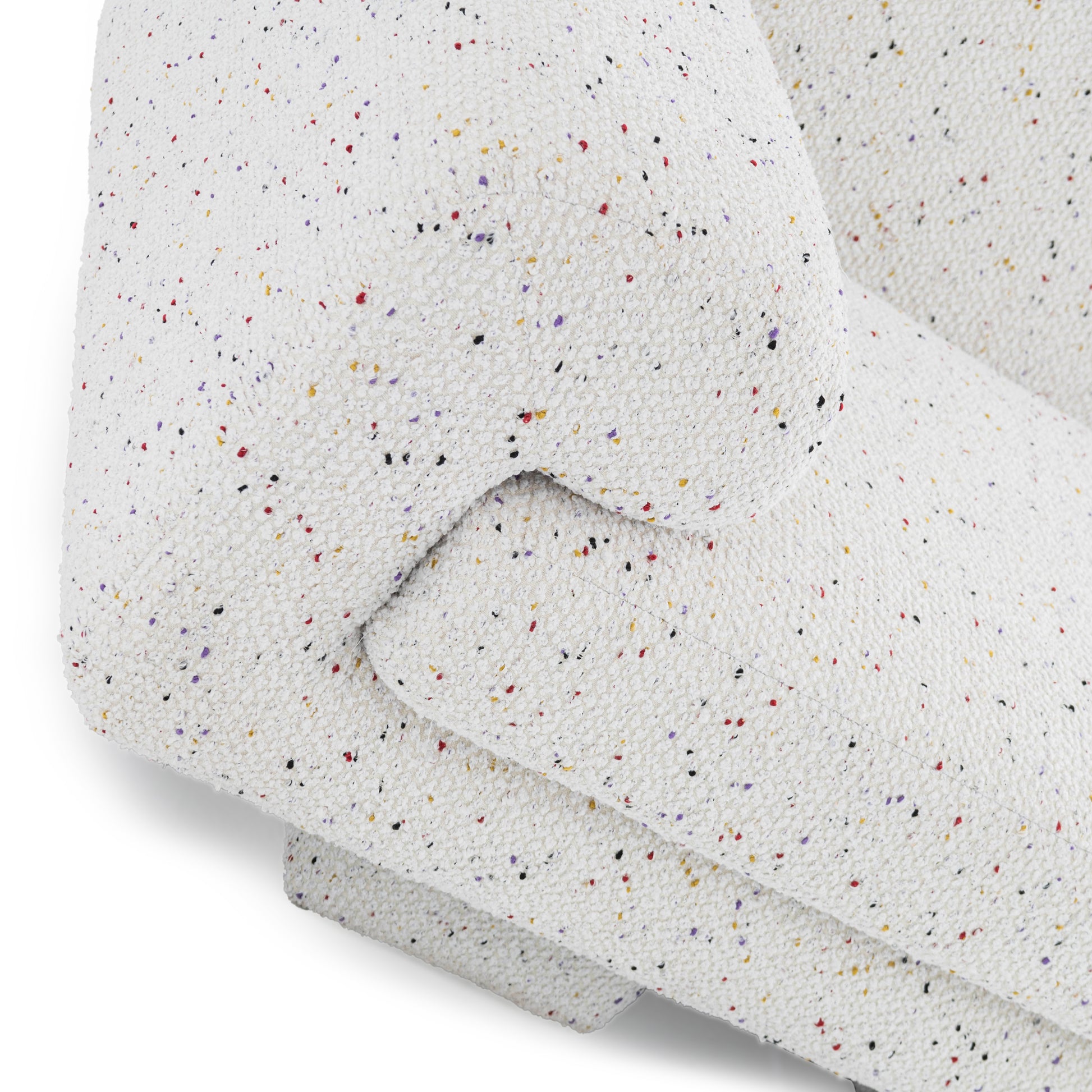 Revêtu d’un tissu bouclé aux éclats multicolores subtils, il devient une pièce forte tout en restant facile à intégrer dans un décor épuré.