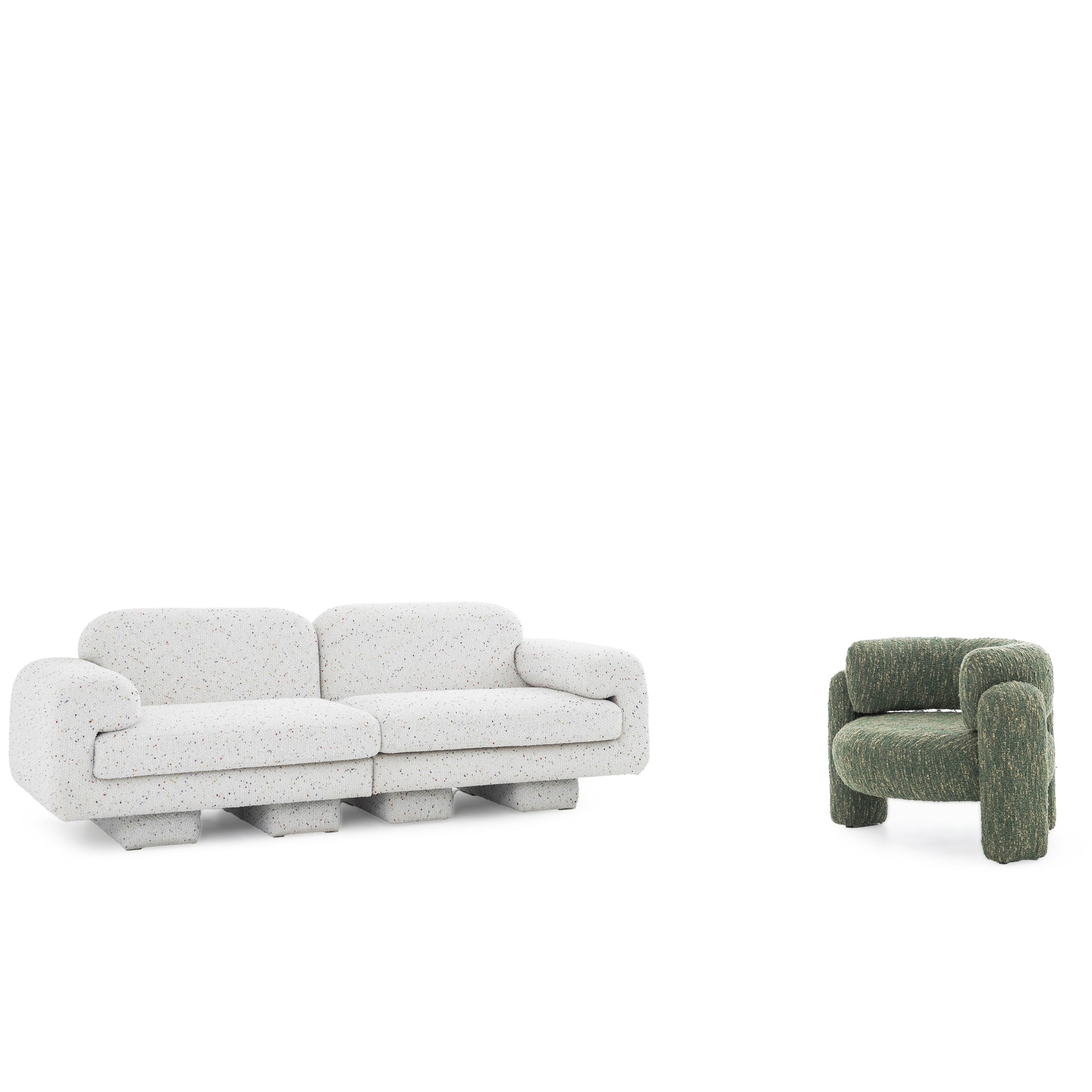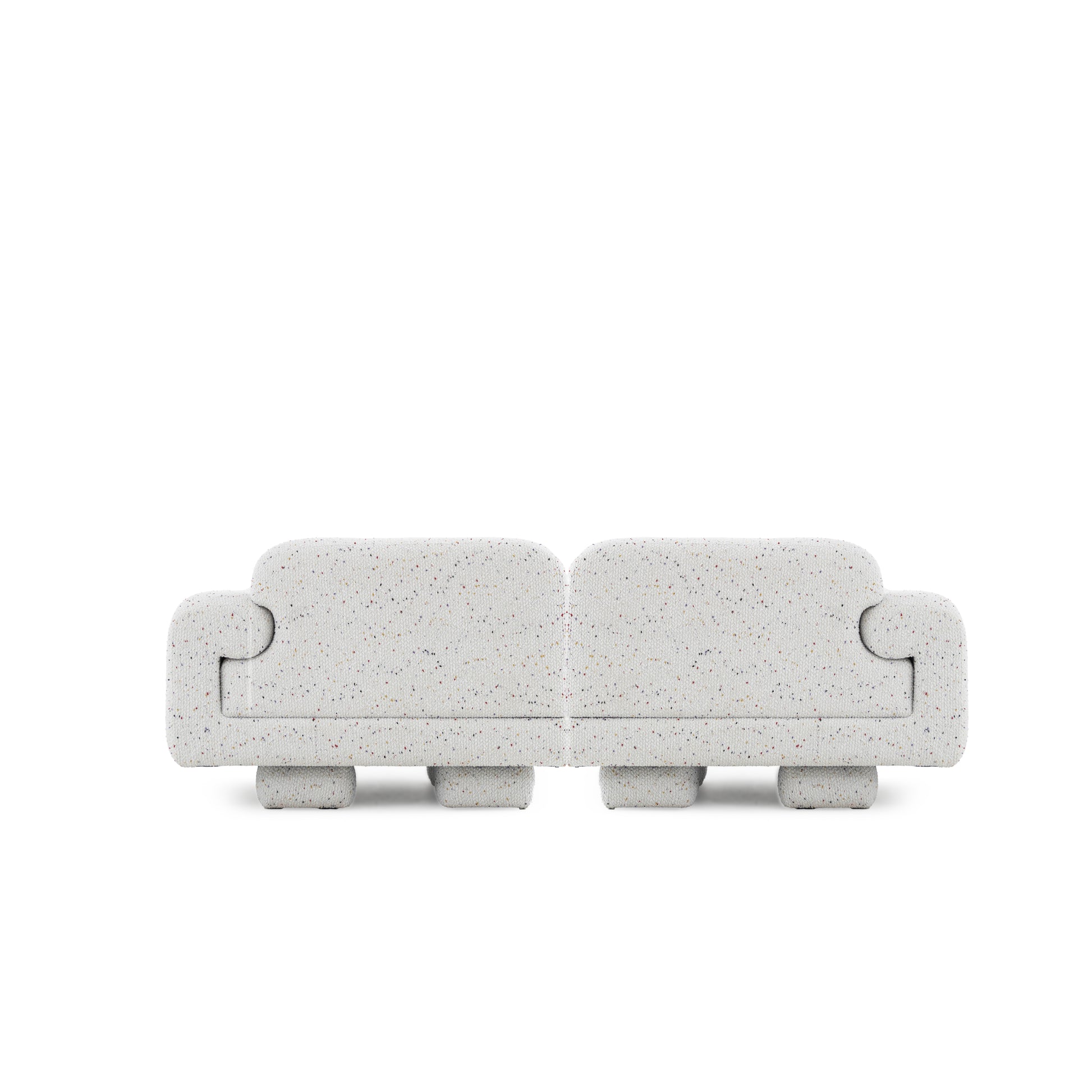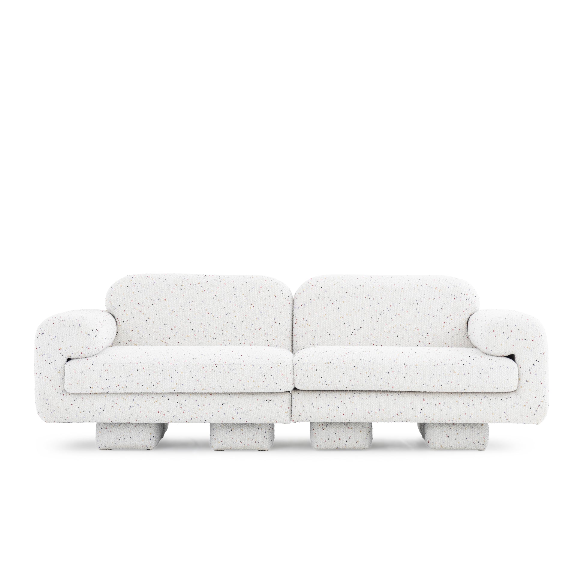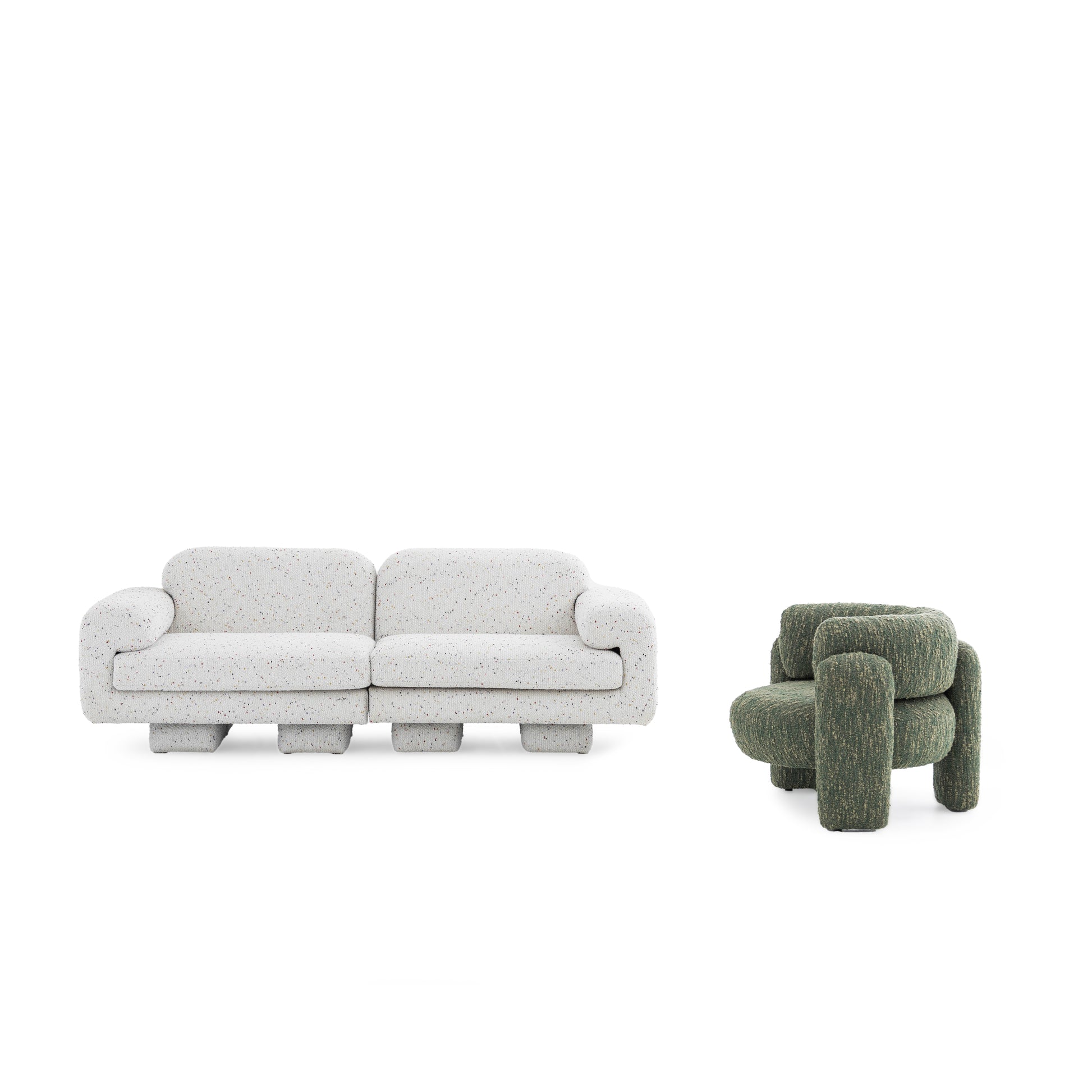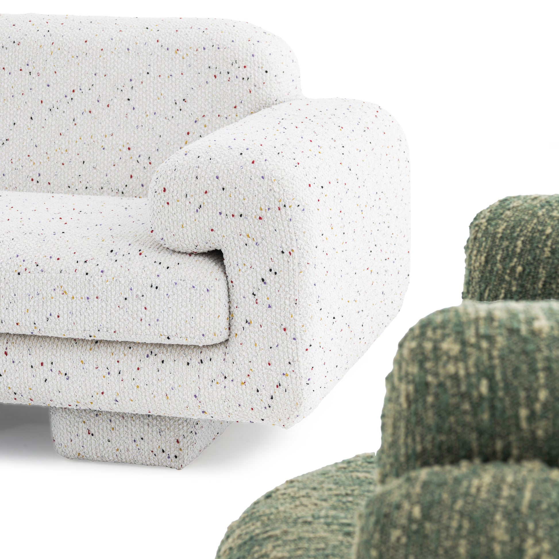 Revêtu d’un tissu bouclé aux éclats multicolores subtils, il devient une pièce forte tout en restant facile à intégrer dans un décor épuré.