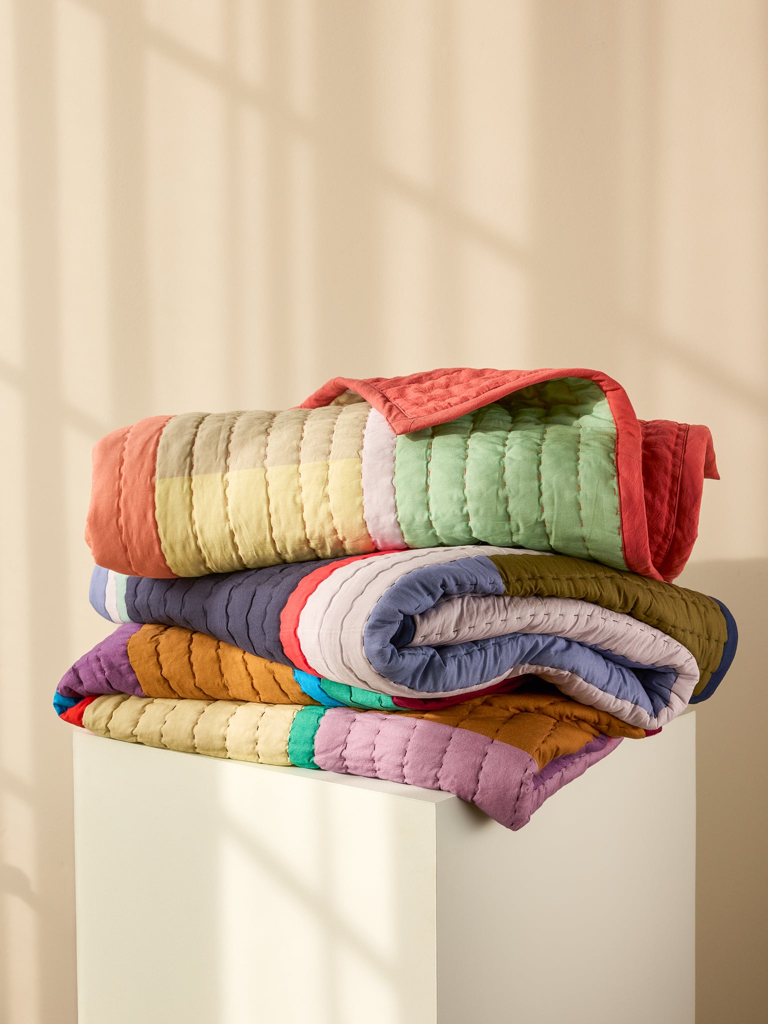 Le Pavilion Plaid se présente dans une palette élégante bleu et multicolore, combinant des nuances bleues et terreuses rehaussées d’une touche de rouge. Confectionné selon une technique de matelassage confortable, ce plaid offre une chaleur enveloppante et un toucher doux grâce à sa composition 100 % coton.